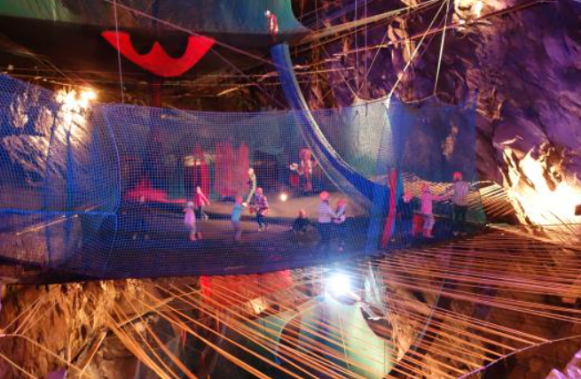 Zip world Slate Caverns 4.4 miles (route map) These Slate caverns house the world first underground and above ground adventures. With views across Snowdonia from the top of Titan, where you can zip 1890m from half the height of Snowdon, and the worlds only subterranean playground of its kind Bounce Below. The most incredible underground adventure zip line.Test your nerve journeying through a mountain via a series of exciting adventurous challenges. Zip lining through caverns, or climb up a vertical shaft. Boat across a lake, traverse over an abyss, scale a waterfall or abseil down to the deepest point in the UK. Its pulse jumping, heart thumping, fun. You will be guided by fun experienced fully qualified instructors. There is something for everyone in all weathers.