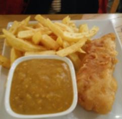 Beer battered fish with hand cut chips mushy peas or garden peas. £9.95