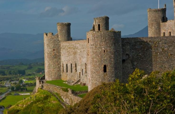 - Harlech castle 01766780552 The castle crowns a sheer rocky crag overlooking the dunes far below. The rugged peaks of Snowdonia rise as a backdrop.